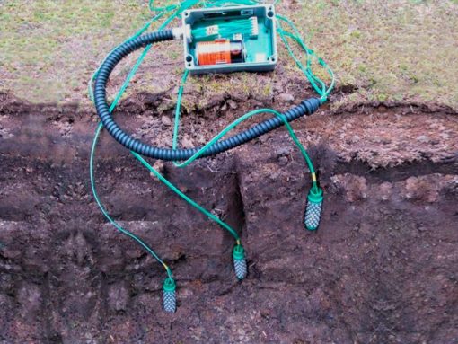 Die optional montierbaren Feuchtesensoren mit einer Kabellänge von 10m misst die Bodenfeuchte, Bodenleitfähigkeit und Bodentemperatur. So kann mit den entsprechenden Bodenparametern noch die ungenutzte Wasseraufnahmekapazität des Bodens bzw. Granulats ermittelt werden. Dies ermöglicht eine bedarfsgerechte Bewässerung.